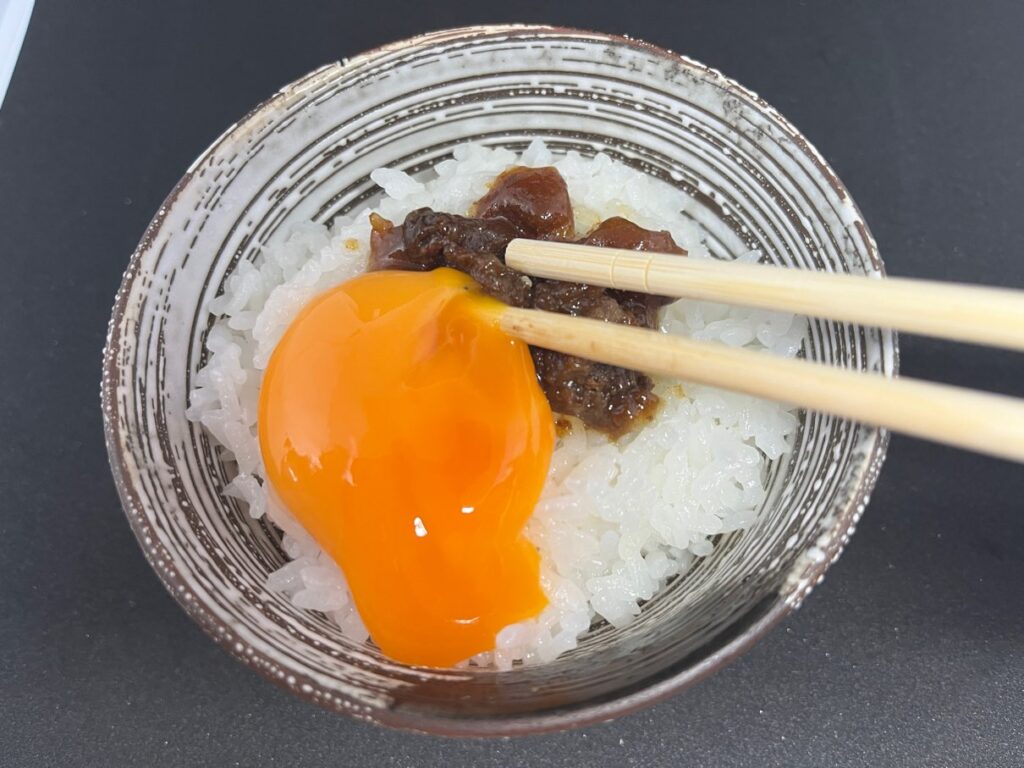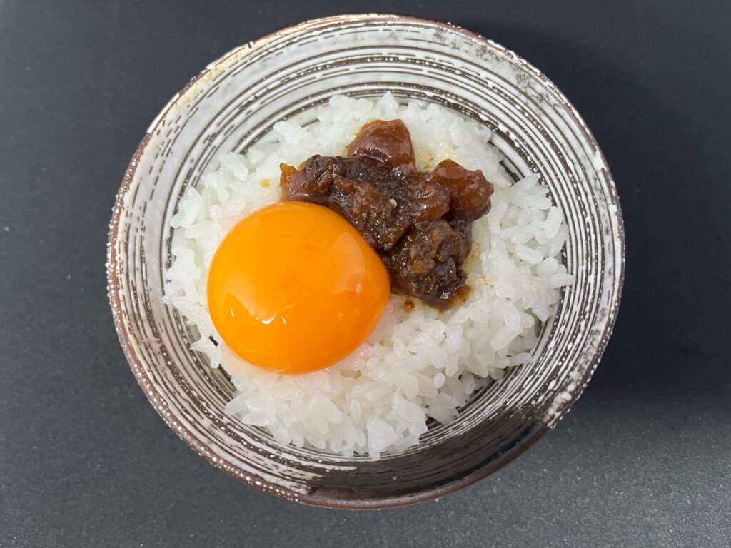 まずはスタンダードに、「大人の牛しぐれの卵かけご飯」です。
